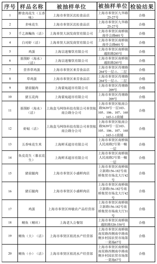 1月,奉贤区市场监管局在全区范围内组织开展“你点我检迎双节”主题活动,通过前期发布的“点选”活动,征集民意,选出了票数较高的2个大类,4个亚类食品,共抽检20批次,检测项目主要包括食品中的添加剂使用情况、污染物、兽药残留以及其他可能影响食品安全的指标,结果全部合格。