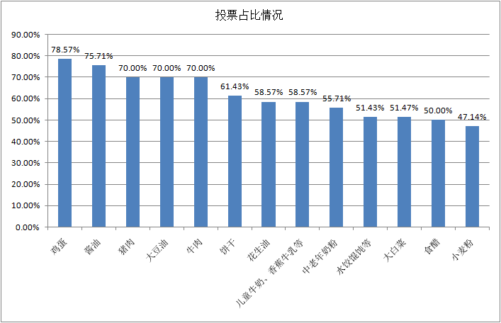 据统计,消费者在本期活动中更关注鸡蛋、酱油、牛羊肉、植物油、调制乳等食品的安全情况,具体投票情况如下:
