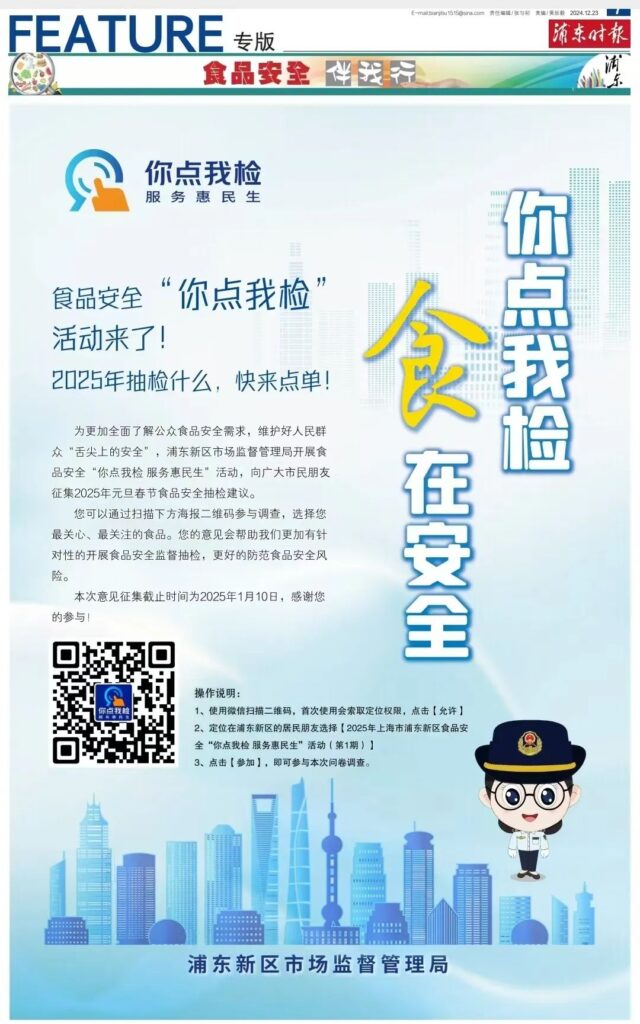 春节前夕,黄浦区市场监管局通过微信公众号发布了2025年第1期黄浦区食品安全“你点我检”调查问卷,面向广大消费者征集食品抽检意见。同时,为进一步扩大“你点我检”宣传效应,区市场监管局还在年味浓郁的豫园商城开设意见征询台,吸引广大消费者扫码参与。