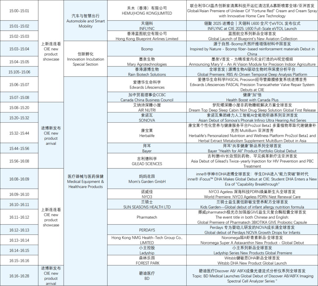 本届“进博新品汇”共安排79场“进博新发布”和58场“上新连连看”。137家展商将在发布会上展示200余项产品,其中85家世界500强及龙头企业参与本届发布活动,涵盖医疗器械及医药保健、汽车及智慧出行、技术装备、消费品、农食产品、服务贸易展区以及创新孵化专区。欢迎关注!届时扫描下图二维码,即可观看于央视新闻客户端或进博会官方抖音账号进行的直播。