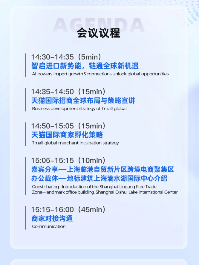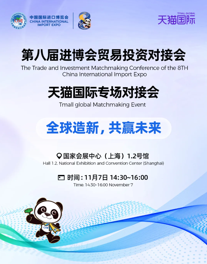 第八届进博会贸易投资对接会——天猫国际专场将于11月7日下午举办。活动主要面向进博会参展海外品牌方,助力展品变商品,服务境外企业、展品快速进入中国大市场。以下为活动具体信息: