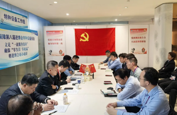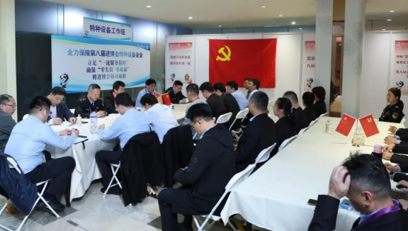 11月8日中午,中共第八届进博会市场监管服务保障组一线临时支部第四党小组(特种设备工作组)在国家会展中心,开展以“吹响保障冲锋号 进博有我守安全”为主题的党日活动暨联组学习会,充分发挥党建引领优势,交流党的二十届四中全会精神学习体会和第八届进博会特种设备安全保障工作经验。