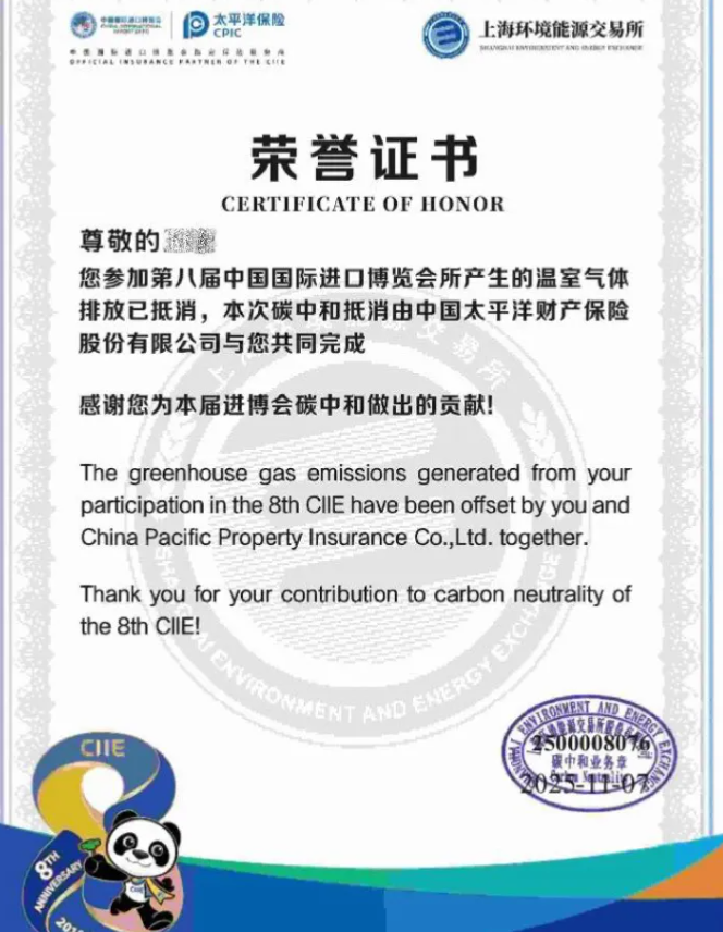 “您参加第八届进博会产生的温室气体排放已抵消。”记者通过扫描标语下方的二维码,记录参展期间的碳足迹并进行碳抵消,随即获得了一份电子版“碳中和证书”。